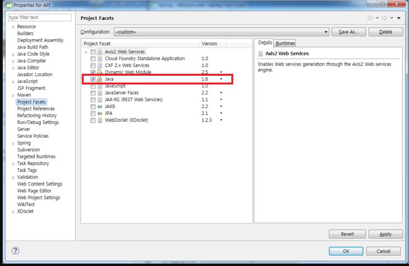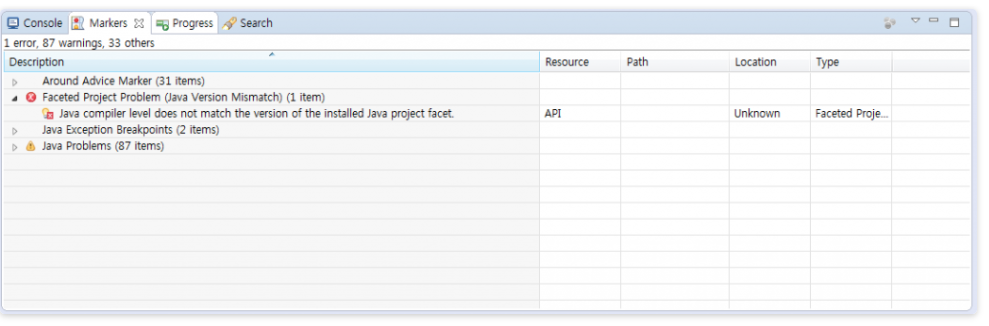 (2) project > properties > Project Facets > Java 를 자신이 사용하고있는 컴파일러 버전과 맞춰야함