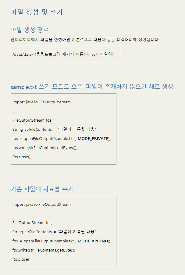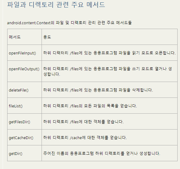 기본적으로 자바의 파일 입출력 스트림을 사용하며, openFileOutput() 과 openFileInput() 을 사용하여 안드로이드 내부 저장장치 에 파일을 생성하여 쓰고 읽기를 합니다.