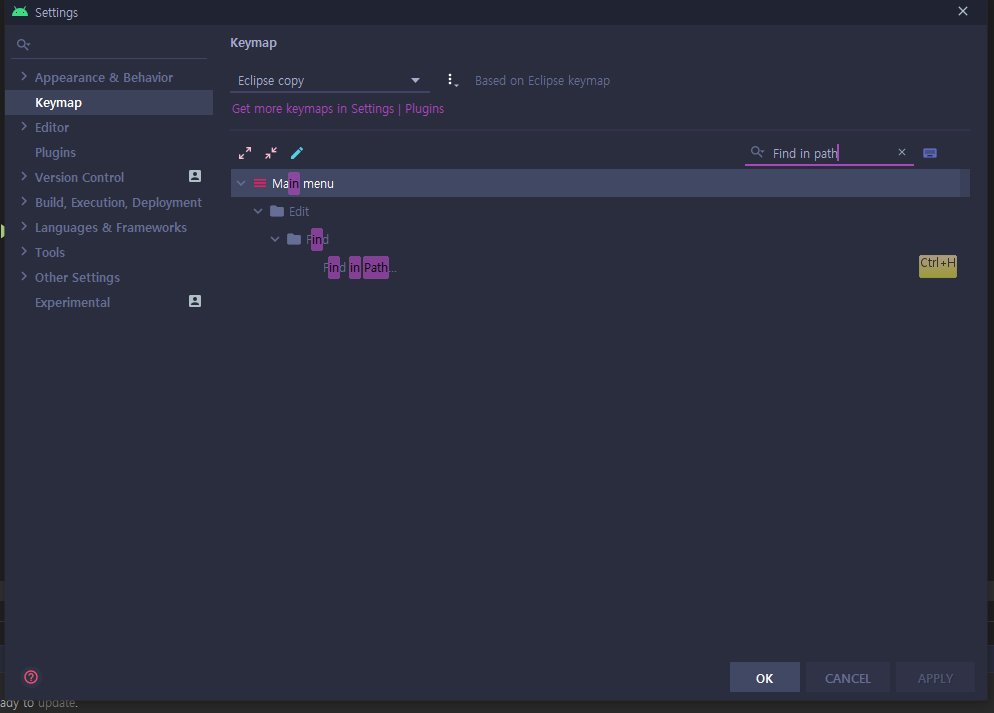 이 경우, Settings -> Keymap에서 아래와 같이 찾으면 나온다.