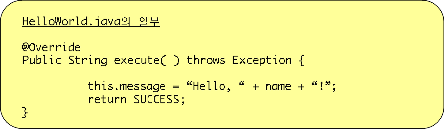 -. execute() 메소드에서는 "Hello," 다음에 요청 파라미터 값(Devil)으로 세팅된 name프로퍼티 값을 연결한 후에 'return SUCCESS;' 하였다.
