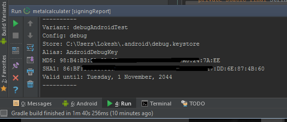 keytool -list -v -keystore ~/.android/debug.keystore -alias androiddebugkey -storepass android -keypass android