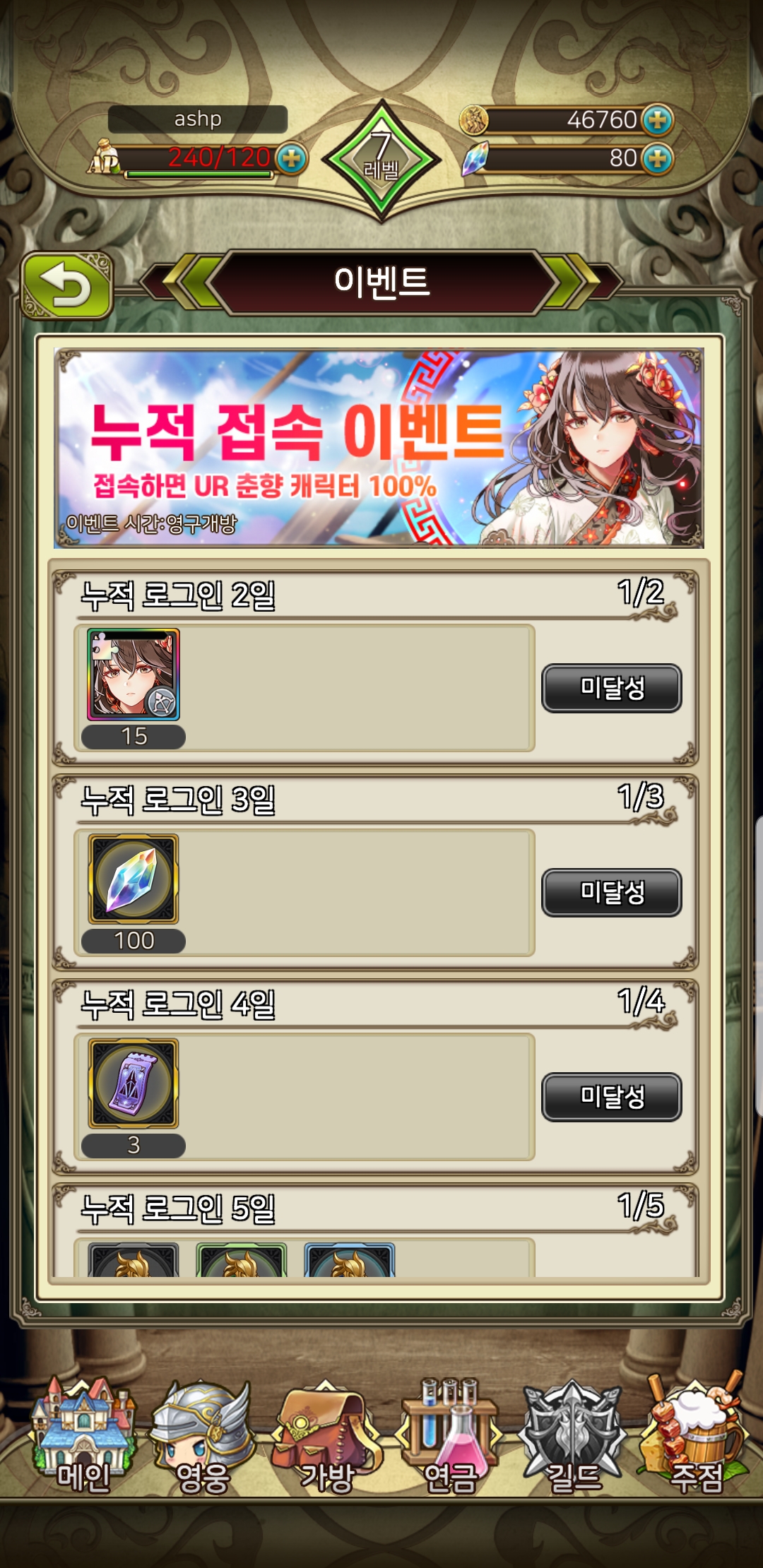 한국캐릭터 중 하나인 '춘향'은 누적로그인 2일만 채우면 아래처럼 쉽게 얻을 수 있는데, 일러스트가 참 수려하네요 :)