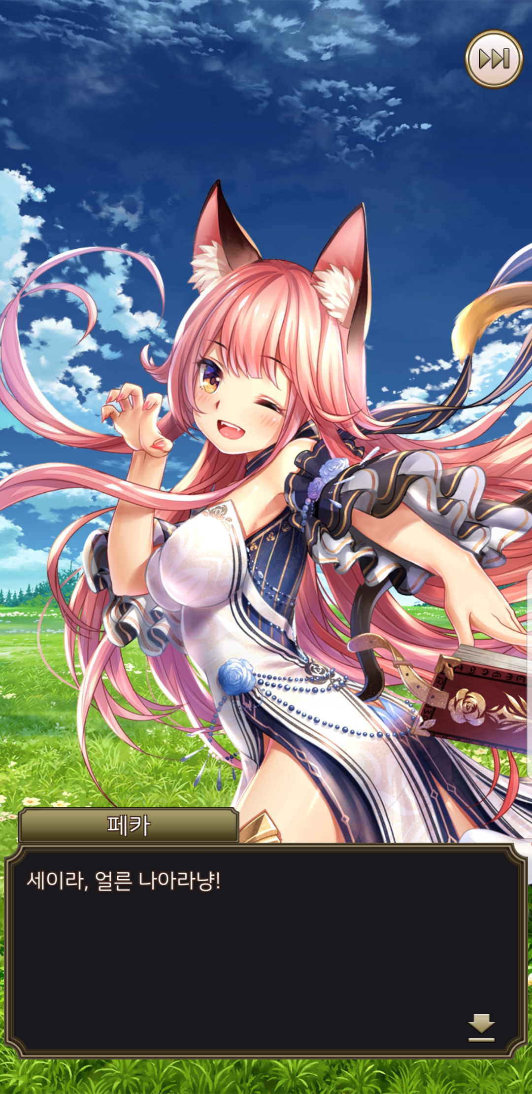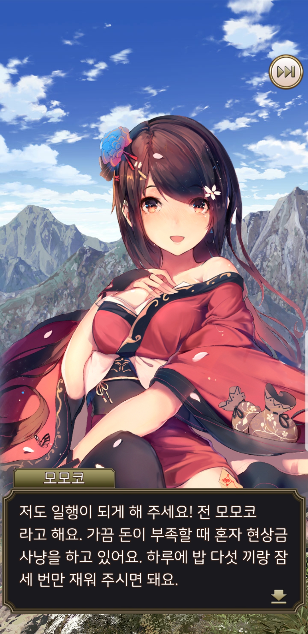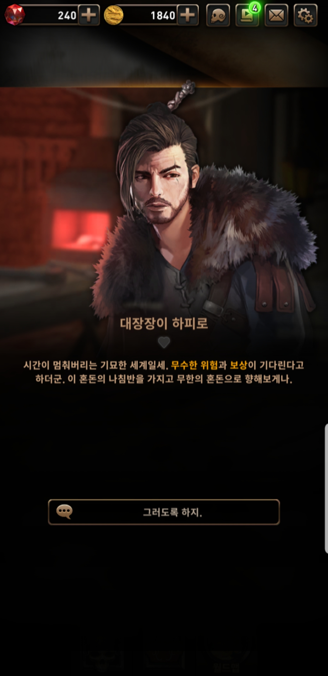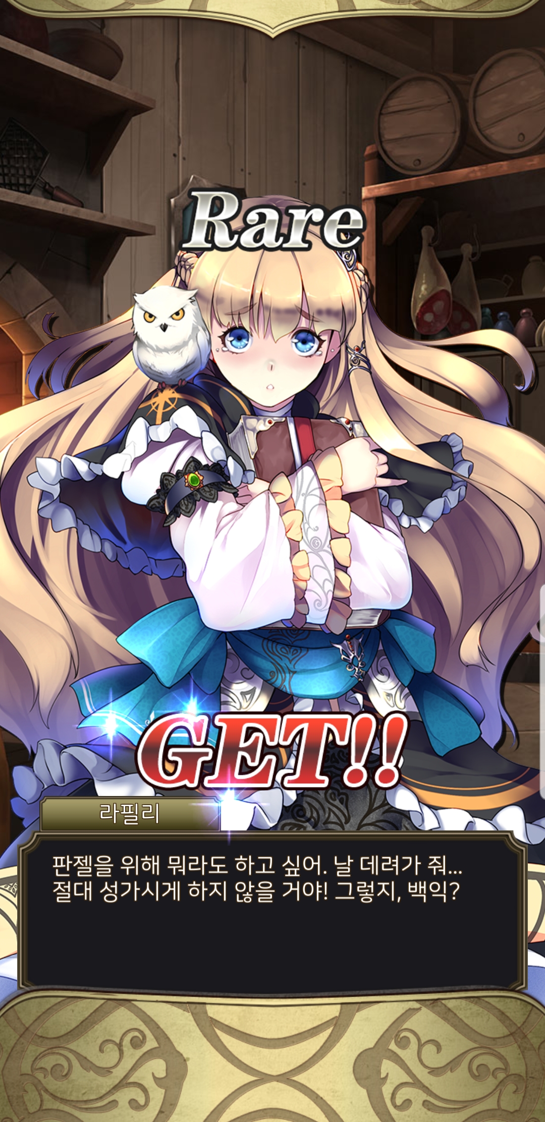 일러스트가 참 제 취향으로 맘에 들지만, 딱히 움직이는 것도 아니고, 다른 장면이라던가 포즈가 바뀐다던가 하지도 않습니다. 밋밋하게 멘트만 바뀝니다. 친밀도가 높아져도 웃는 표정 하나 짓는게 아니라 하트뿅뿅 이펙트만.... 그러다보니 전투 외적인 재미는 딱히 없네요. 반복적으로 노가다해서 강화하고 레벨업하고...
