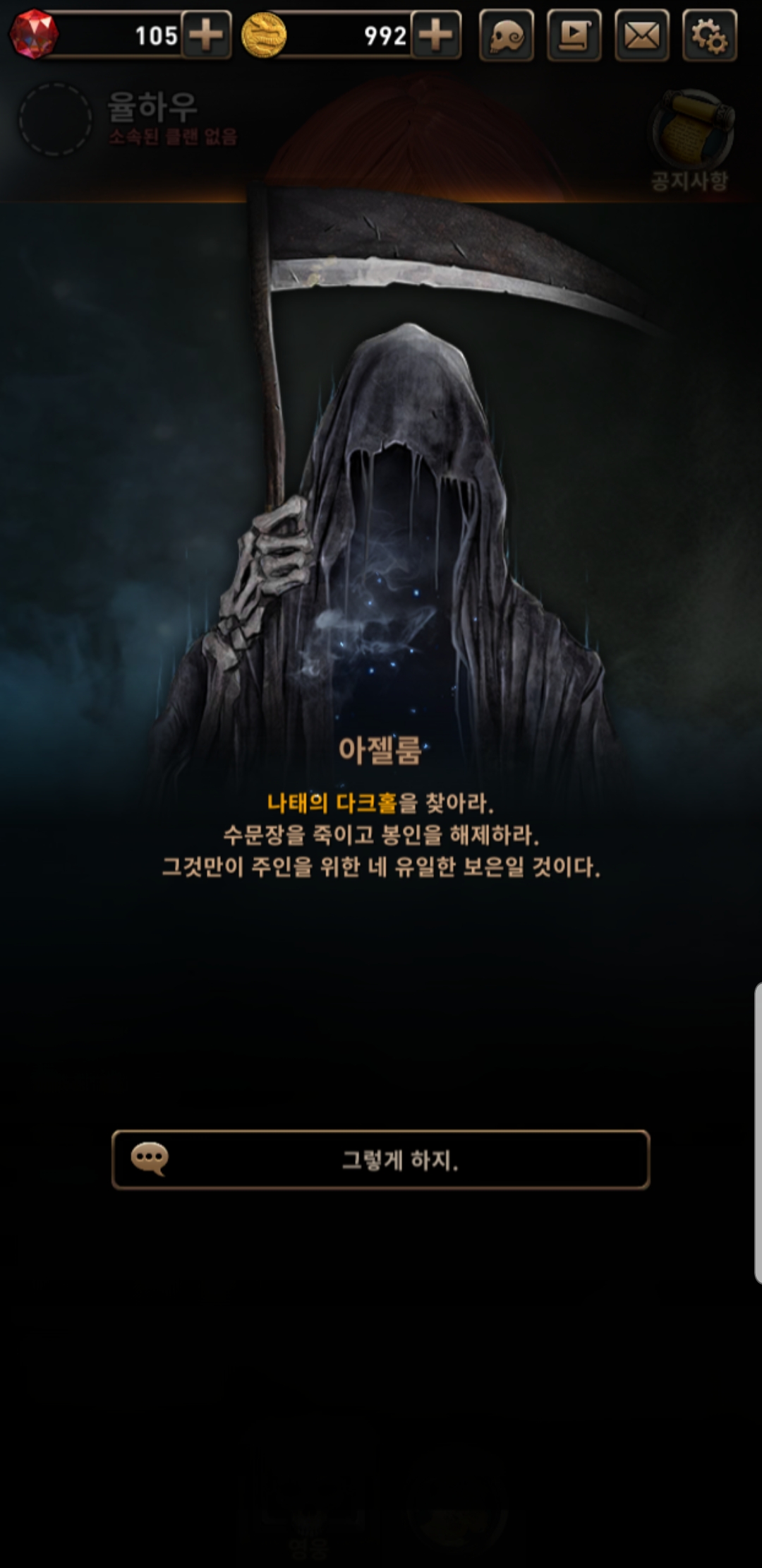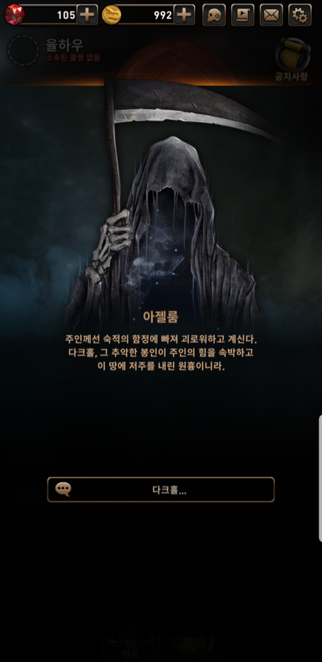 아젤룸에 따르면, '검은 뱀'은 '다크홀'의 함정에 빠져 봉인 당한 모양입니다. 그리하여 각 5개의 구역마다 존재하는 다크홀을 찾아 수문장을 죽이고 '검은 뱀'의 봉인을 해제하는 것이 이 게임의 메인 퀘스트입니다.