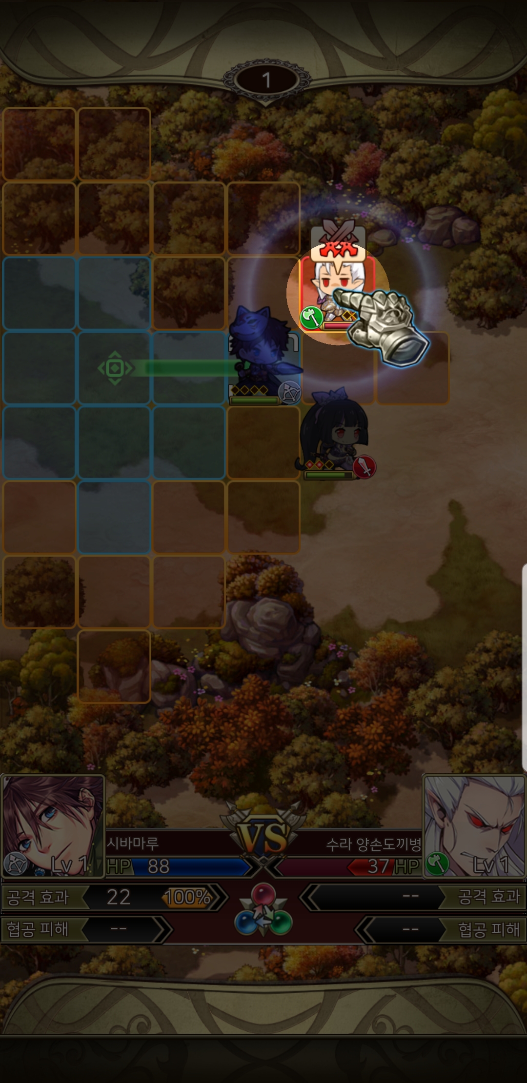 - 공격방법은 각 턴마다 칸에 맞춰서 영웅을 원하는 위치에 드래그 하여 이동, 공격대상을 선택합니다.