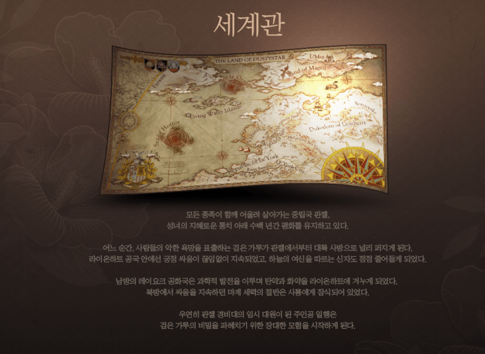 만물이 아직 구분되지 않던 세상, 신비한 나선의 힘은 만물을 깨우고, 광활한 더스티스타 대륙을 만들었습니다. 아래가 더스티스타 대륙의 지도인데요.
