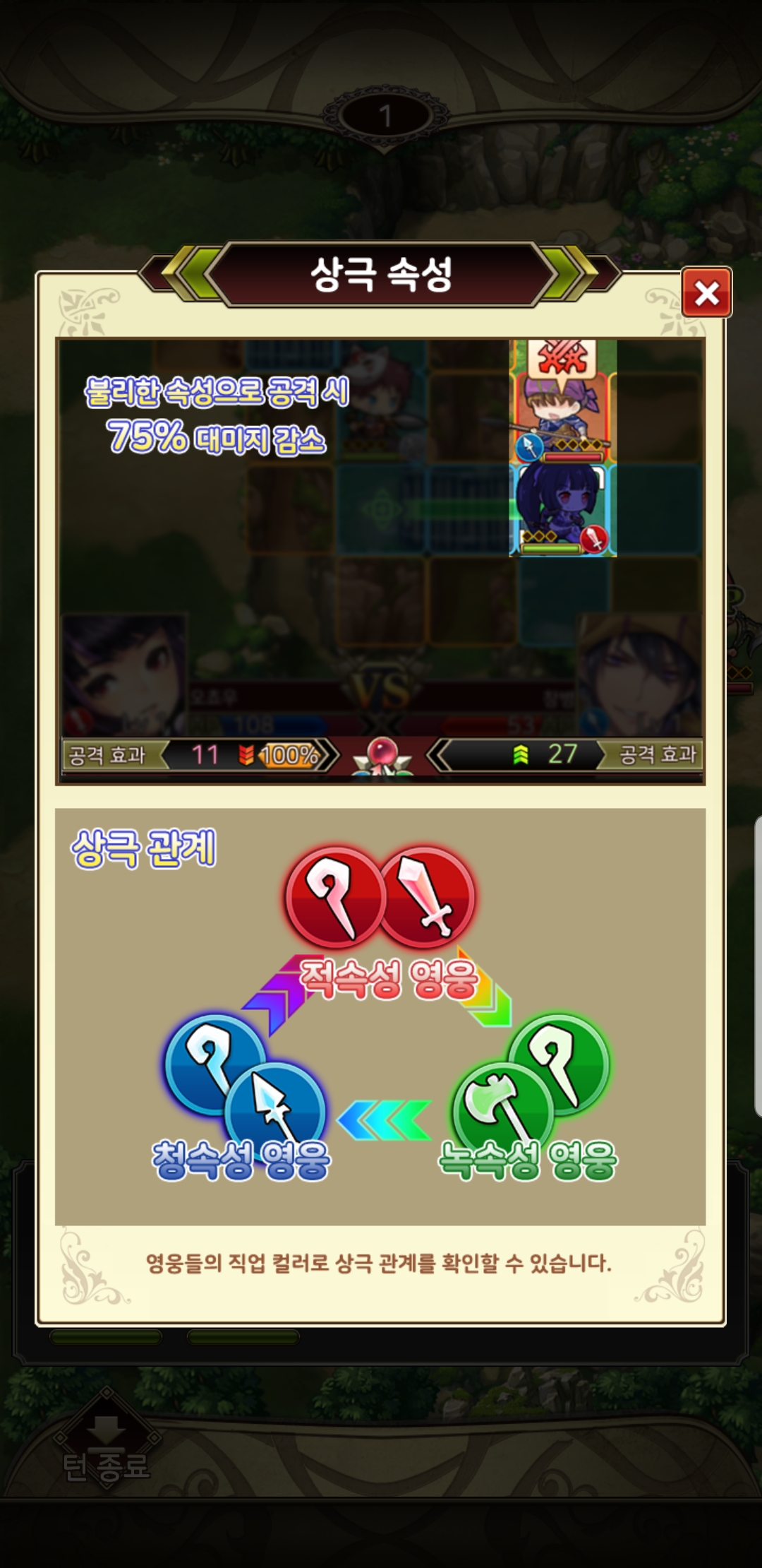 - 영웅과 적은 각각 속성을 지니고 있는데, 아래처럼 상극속성이 존재하고, 이에 따라 데미지가 달리 적용되니 숙지하시는게 좋습니다.