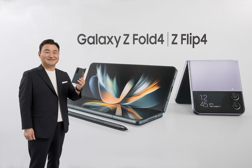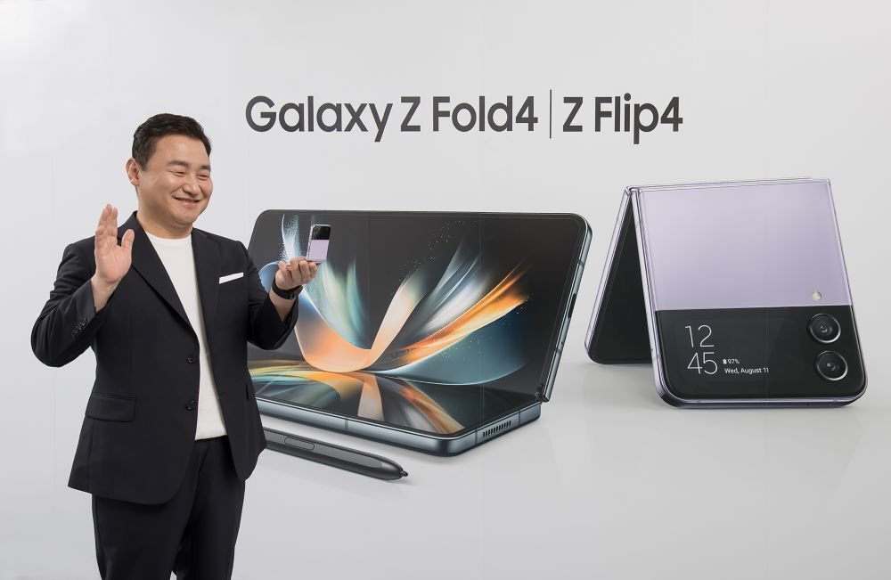 ▲10일(한국시간) ‘삼성 갤럭시 언팩 2022 (Samsung Galaxy Unpacked 2022: Unfold Your World)’에서 삼성전자 MX사업부장 노태문 사장이 차세대 폴더블 스마트폰 ‘갤럭시 Z 플립4(Galaxy Z Flip4)’와 ‘갤럭시 Z 폴드4(Galaxy Z Fold4)’를 소개하고 있다.