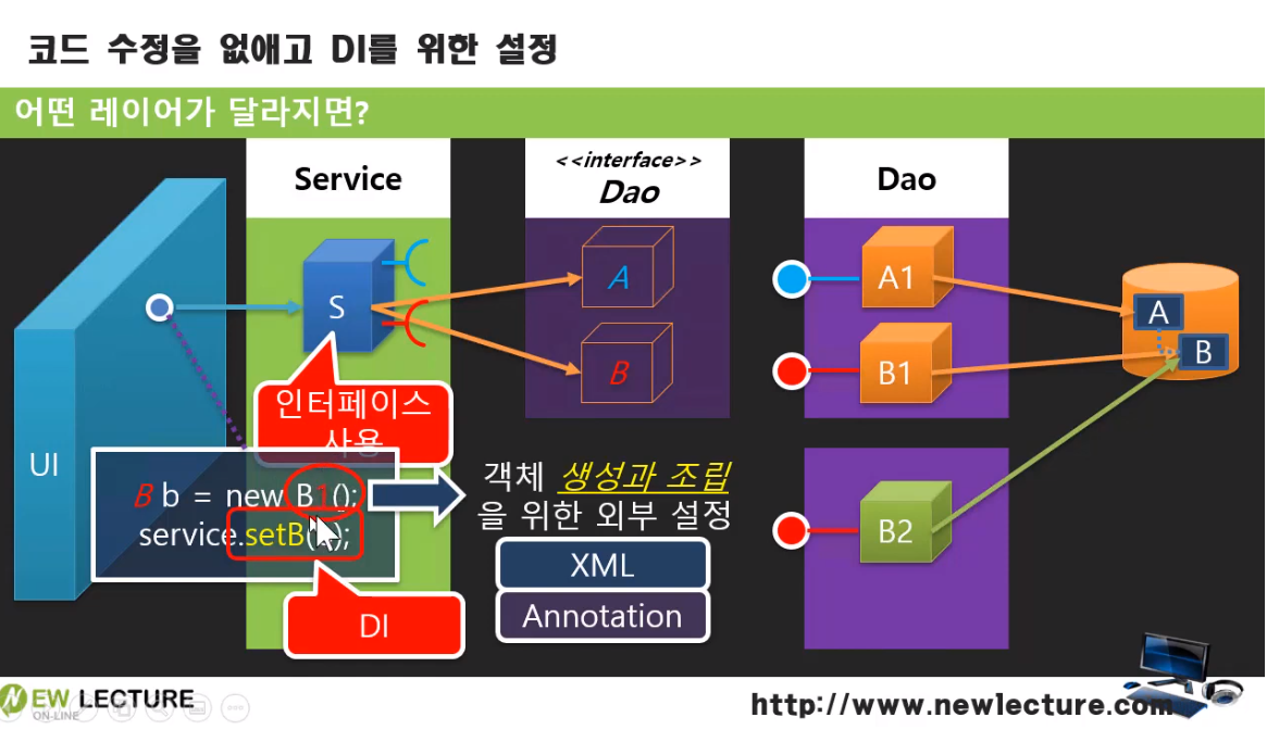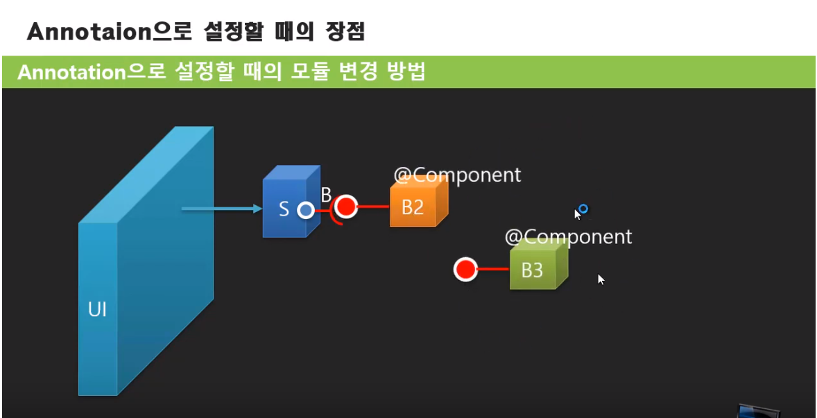 초기에 xml로 설정을 할 때, 코드를 건드리지 않고, xml만으로 객체를 B2에서 B3로 바꿀 수 있다는 것 자체만으로도 좋았지만, 나중에는 이 변경에 따른 것 마저 자동으로 바뀌었으면 하고 바라게 됨.