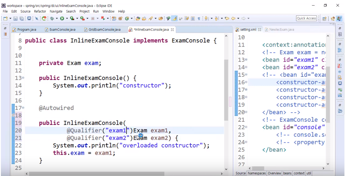 overload 생성자에 붙일 경우, 그냥 붙이면 에러가 발생할 수 있는데, 이유는 overload 생성자에서는 입력하려는 동일유형 객체가 여러개일 수 있기 때문. 따라서 파라미터 자리별로 @Qualifier로 지정할 수 있음.