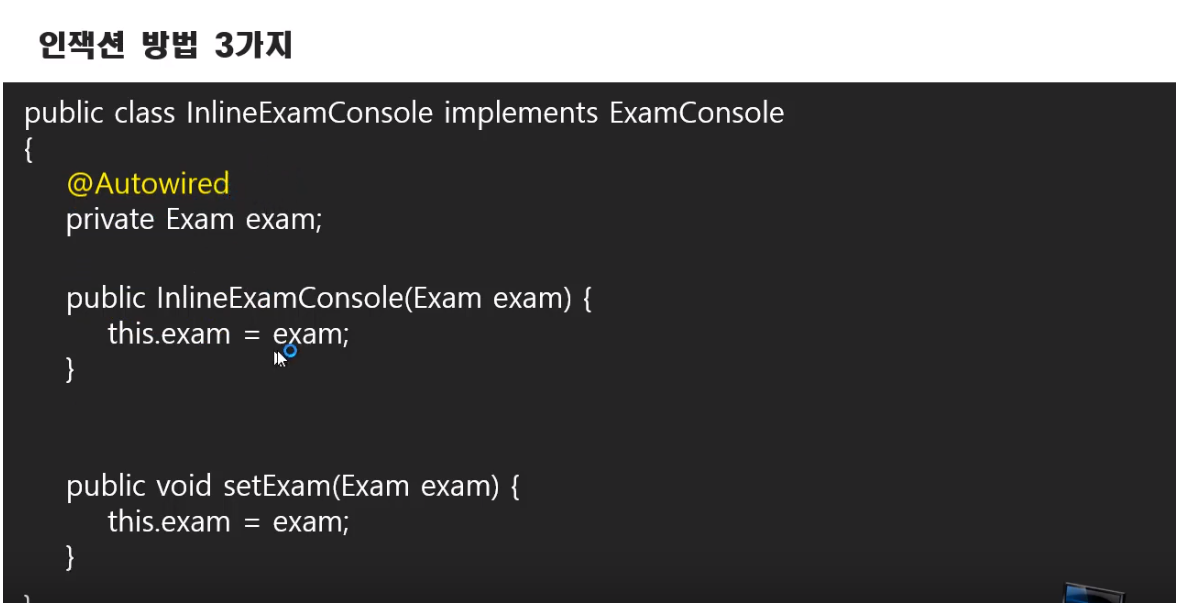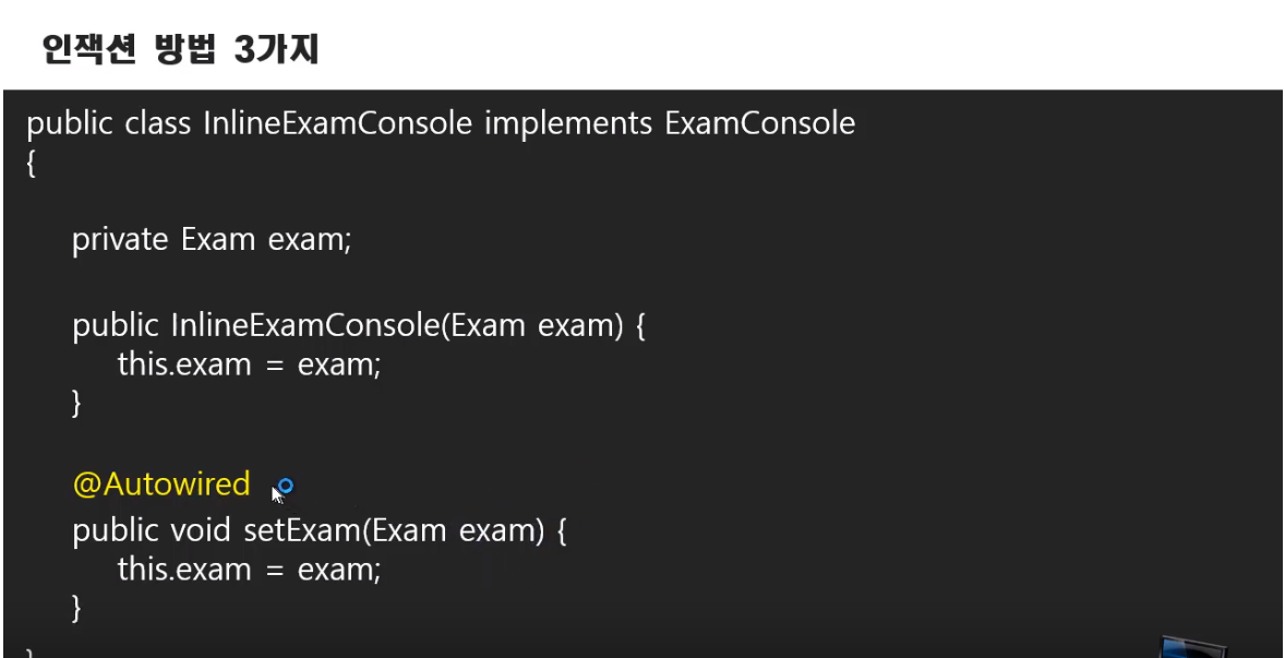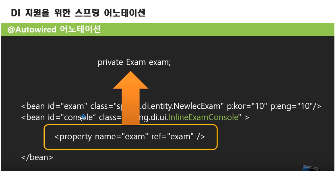 이전에 xml방식에서 property로 설정해서 injection하던 방식 ==> annotation에서는 @Autowired로 대체 가능